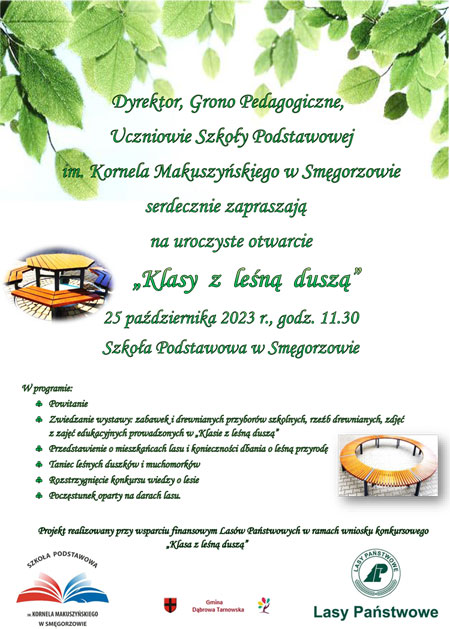 Szkoła Podstawowa im. Kornela Makuszyńskiego w Smęgorzowie serdecznie zaprasza na uroczyste otwarcie „Klasy z leśną duszą”, która powstała przy wsparciu finansowym Lasów Państwowych.
