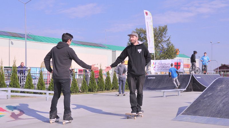 Burmistrz podkreślił zalety dąbrowskiego skateparku jako miejsca spotkań młodzieży, umożliwiającego ruch na świeżym powietrzu.