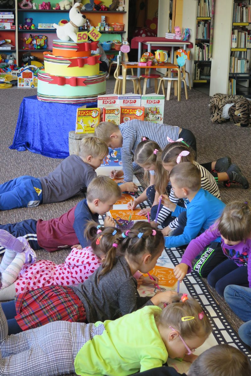 Wszystko rozpoczęło się od głośne lektury przygód Reksia, a czytali Burmistrz Dąbrowy Tarnowskiej i wychowawca 6-24 Hufca Pracy w Dąbrowie Tarnowskiej pani Grażyna Kochanek wraz z podopiecznymi. Nie obyło się też bez pogadanki o historii tego bohatera i wspominania jego przygód na wiejskim podwórku. W wielkim finale tego wyjątkowego ranka przedszkolacy skonstruowali kolorowy tort dla jubilata, w którego środku zawarli narysowane przez nich życzenia dla Reksia. W godzinach popołudniowych wszystkie chętne dzieci w różnym wieku wzięły udział w warsztacie literacko-plastycznym, podczas którego, prócz wspólnego czytania opowieści o Reksiu, dzieci pod okiem bibliotekarek wymyśliły i zmalowały własną historyjkę o tej kultowej postaci i jego kumplach z podwórka. Do zajęć wykorzystaliśmy książeczki z szablonami o Reksiu i inne, w tym najnowsze bajeczki o tym piesku. Zapraszamy dzieciaki do wypożyczania tych książek w naszej bibliotece, niech urodziny Reksia trwają jeszcze długo i długo…