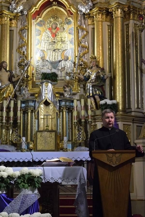 Ks. proboszcz Ryszard Kowalski opowiadał o odporyszowskim kościele, sięgającym swoją historią XVII w. Świątynia w stylu barokowym została zbudowana w tym miejscu nie przez przypadek – tutaj bowiem objawiła się w 1572 r. Maryja w podobiźnie odporyszowskiego obrazu. To jedno z trzech świętych objawień w Odporyszowie. Fragment krzyża, na którym ukazała się Matka Boska, jest zachowany na tyłach wielkiego ołtarza. Można go tam zobaczyć i dotknąć.