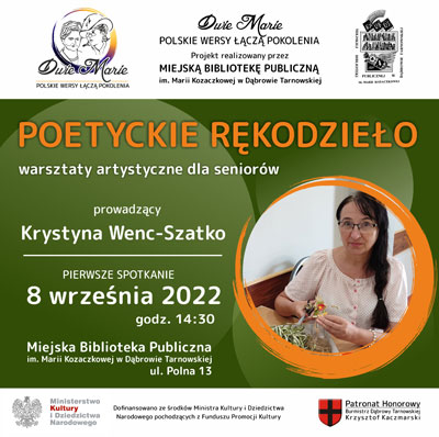 W powakacyjnej części projektu „Dwie Marie – polskie wersy łączą pokolenia” Miejska Biblioteka Publiczna w Dąbrowie Tarnowskiej kieruje swoją ofertę szczególnie do seniorów, proponując im udział w warsztatach artystycznych pt. „Poetyckie rękodzieło”.