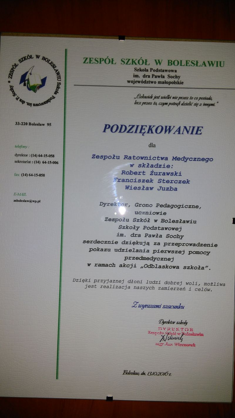 13.10.2016 r. Ratownicy Medyczni z Pogotowia Ratunkowego w Dąbrowie Tarnowskiej wzięli udział w pokazach w udzielaniu pierwszej pomocy w ramach akcji ,,Odblaskowa szkoła” Pokaz odbył się w Zespole Szkół w Bolesławiu.