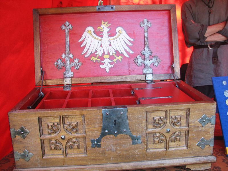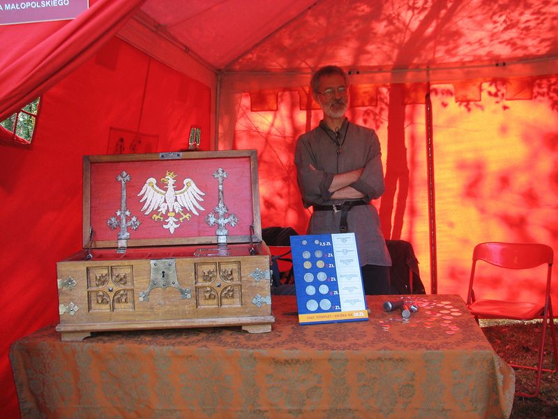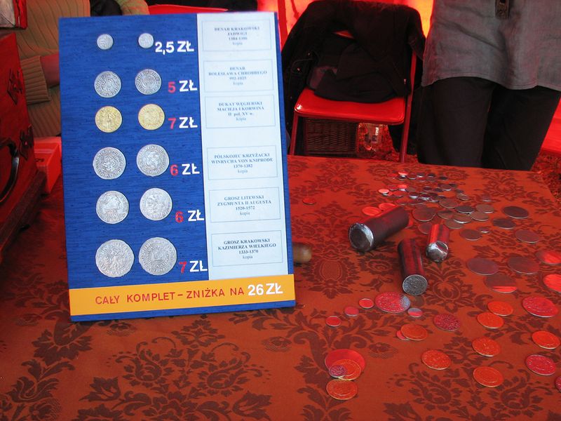 Bito: denar krakowski królowej Jadwigi, denar Bolesława Chrobrego, dukat węgierski Macieja Korwina, półskojec krzyżacki, grosz litewski Zygmunta Augusta oraz grosz krakowski Kazimierza Wielkiego. Kiedyś monety takie były oficjalnym środkiem płatniczym. Dodatkowo, czego można się było dowiedzieć podczas warsztatów (a o czym mało, kto teraz wie) monetę (wykonaną przecież często z cennych kruszców) ucinano, jeżeli towar, który chciało się zakupić był tańszy, niż jej równowartość. Stąd w wykopaliskach archeologicznych znajdowano niepełne monety.