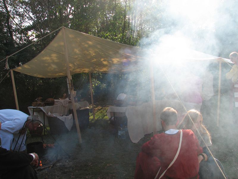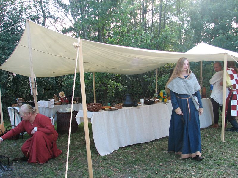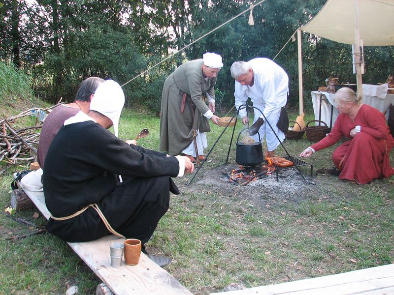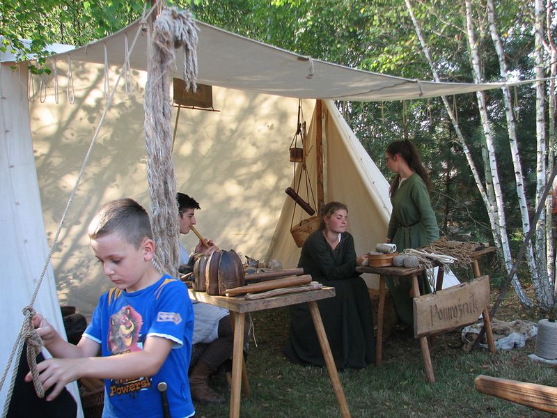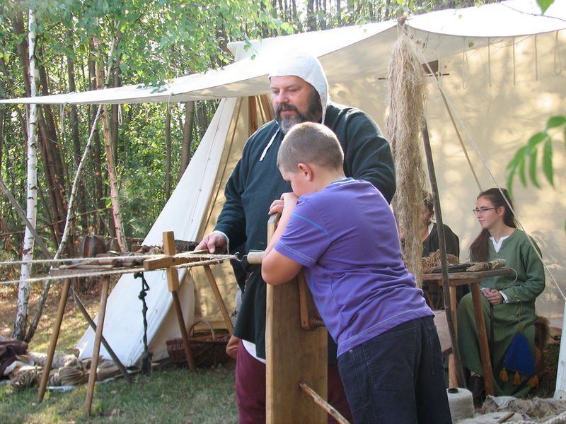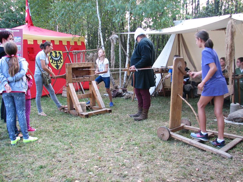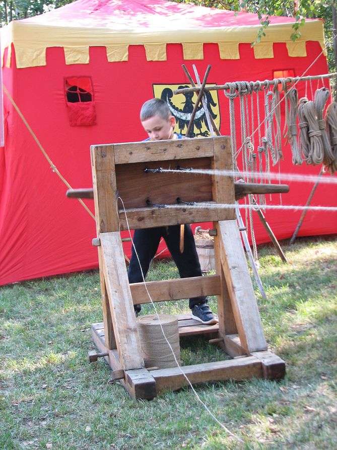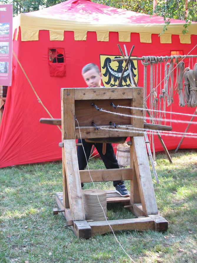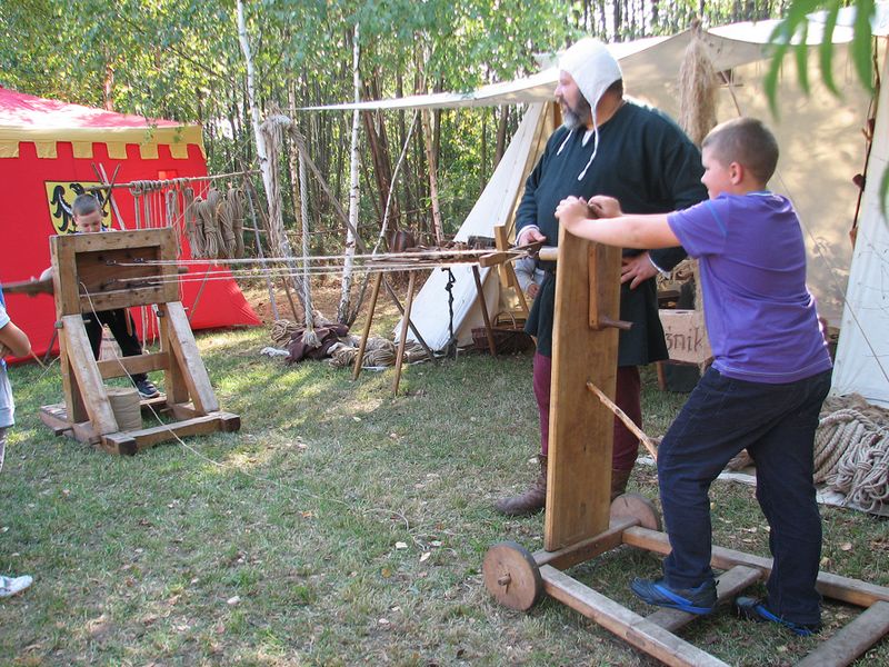 I tym razem – podobnie jak podczas poprzedniej imprezy pod Wieżycą – niemal wszystko było rodem ze średniowiecza, a konkretnie – z XIII w. Od strojów, przez potrawy przyrządzane na ruszcie zrekonstruowanym na podstawie wykopalisk archeologicznych, aż po maszynę do kręcenia sznura, którą rozłożono – bagatela – na ponad 150 metrach włości Bagiennych. Nie zabrakło uczniów chętnych do jej obsługi, a każdorazowo sznur kręciły dwie osoby.