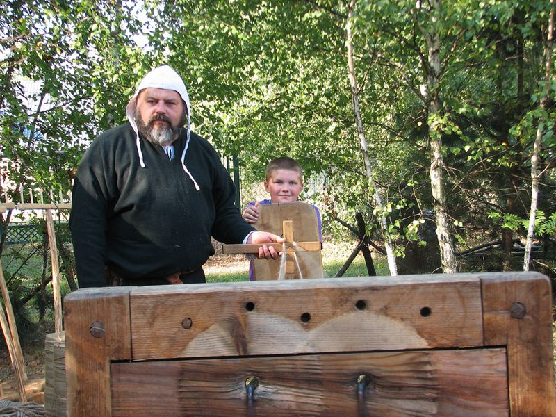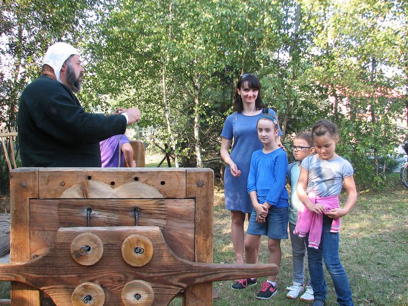 Jak na warsztaty historyczne przystało, uczniowie przybyli pod Wieżycę mieli okazję kręcić sznur na maszynie wzorowanej na rozwiązaniach średniowiecznych. Takie maszyny w całości nie dotrwały do naszych czasów, ale zachowały się świadectwa ich elementów w znakach i herbach powroźniczych, dzięki czemu można było odtworzyć przeszłość dla współczesnych. Bo w gruncie rzeczy o to tu chodzi – zrekonstruować i przybliżyć średniowiecze współczesnym, zwłaszcza dzieciom i młodzieży.