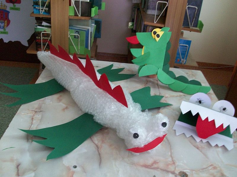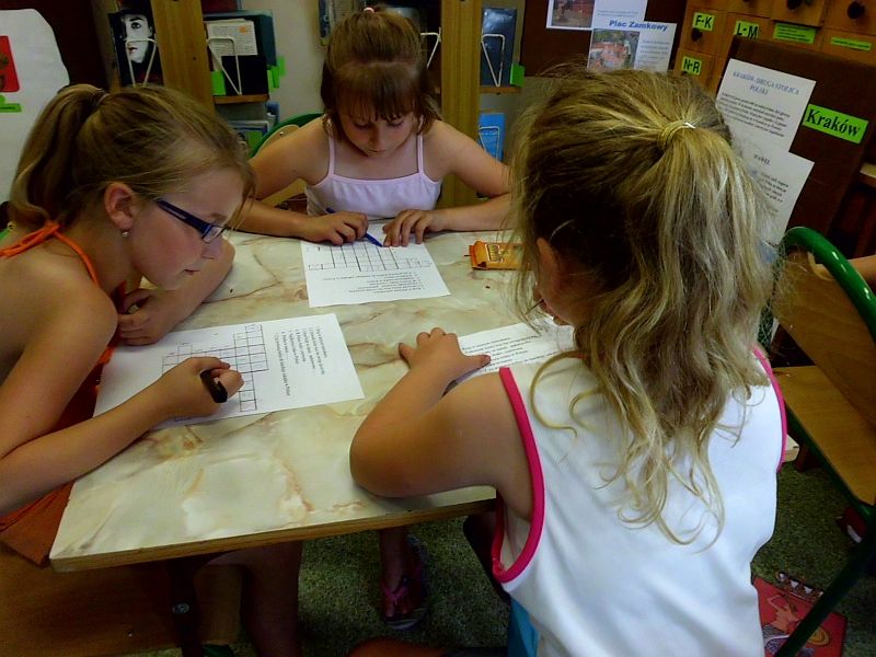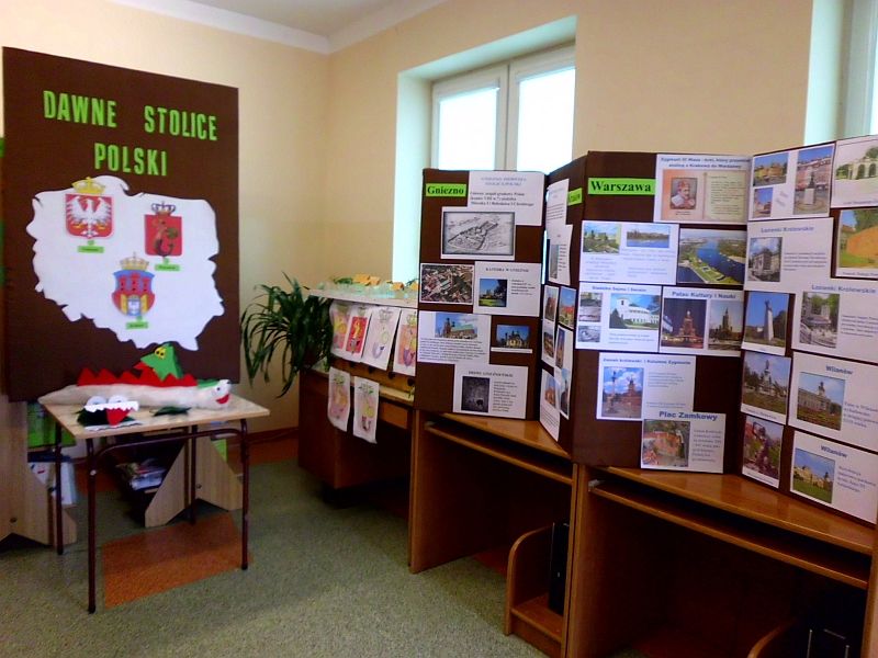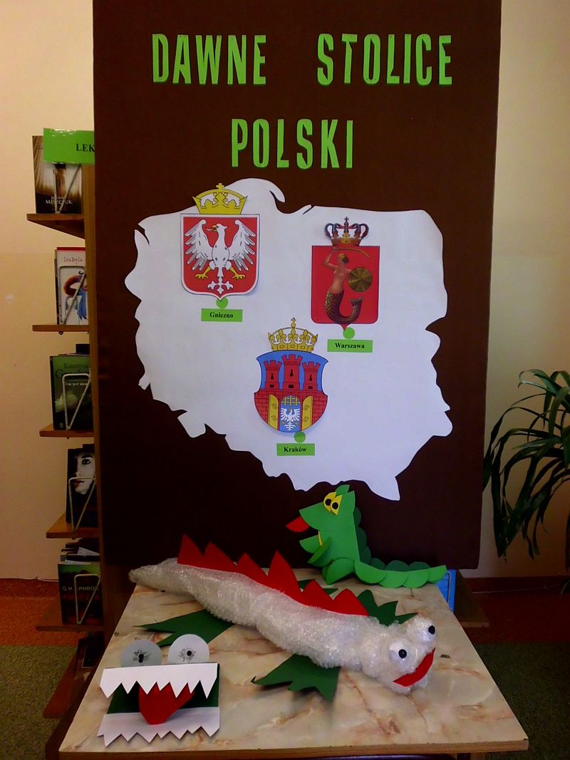 Rozwiązywano też tematyczne krzyżówki, łamigłówki związane z krakowskimi osobliwościami. Na zakończenie trzydniowych spotkań przeprowadzono krótki test sprawdzający, podczas którego dzieci wykazały się dużą wiedzą na temat poznanych legend. Wiedziały kto mieszkał w jamie tuż nad Wisłą i zionął ogniem jak ognisko, lub kim była ogoniasta panienka, która miecz i tarczę trzyma w rękach. Bezbłędnie rozwiązali krzyżówkę i z łatwością odpowiadali na zadawane pytania. Wykonując swoje zadania korzystali ze zbiorów biblioteki : Legendy Polskie, Polska – przewodnik, Słownik encyklopedyczny, przewodniki Kraków, Warszawa. Legendy rozwinęły wyobraźnię dzieci co było widać podczas wykonywania prac plastycznych. Uczestnicząc w zajęciach dzieci mogły przenieść się na chwilę w czasie i poczuć bohaterami danej opowieści. Dla tych, którzy nie mogli być z nami przygotowaliśmy wystawę “Dawne stolice Polski “, która przedstawia krótką historię najstarszych stolic, jej herby i najważniejsze zabytki. Elementem uzupełniającym są prace dzieci wykonane podczas spotkań.
