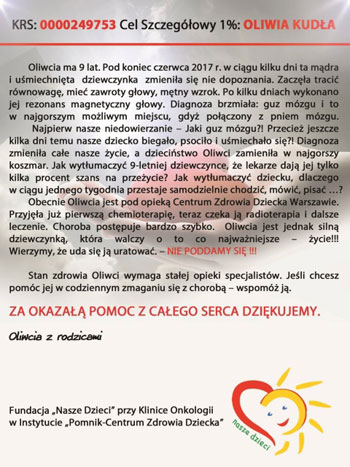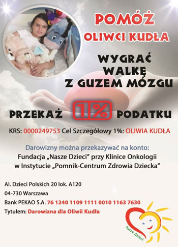 Zwracamy się z gorącym apelem do wszystkich ludzi dobrej woli o wsparcie finansowe na pokrycie kosztów leczenia Oliwki Kudła – małej mieszkanki gminy Mędrzechów. U dziewczynki kilka tygodni temu wykryto guza mózgu.