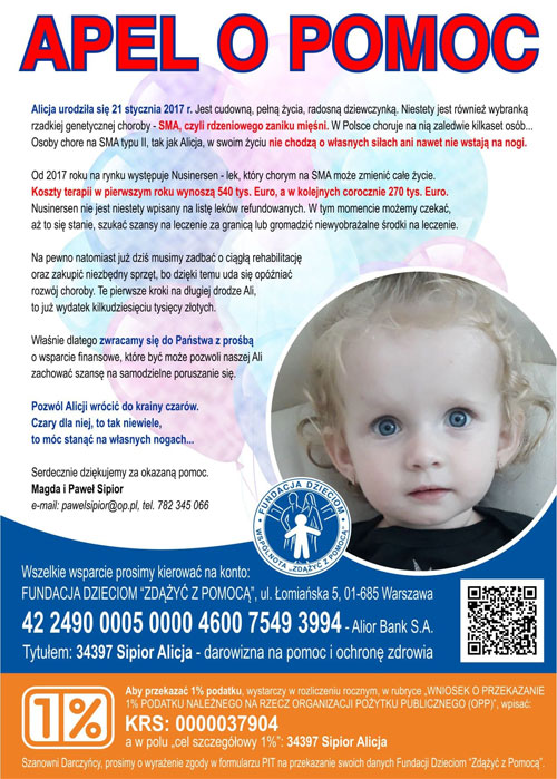 Pozwól Alicji wrócić do krainy czarów. Czary dla niej, to tak niewiele, to móc stanąć na własnych nogach… – w tak poruszających słowach Magda i Paweł Sipior – rodzice małej Alicji apelują o pomoc w leczeniu ich chorej córeczki, która zapadła na rzadką i ciężką chorobę genetyczną, SMA, rdzeniowy zanik mięśni typu II.