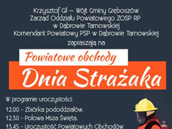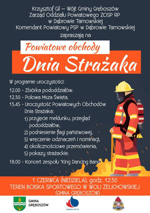 Wójt Gminy Gręboszów Krzysztof Gil, Zarząd Oddziału Powiatowego ZOSP RP w Dąbrowie Tarnowskiej, Komendant Powiatowy PSP w Dąbrowie Tarnowskiej mł. bryg. Marek Bator zapraszają na Powiatowe Obchody Dnia Strażaka, które odbędą się w niedzielę, 1 czerwca na boisku sportowym w Woli Żelichowskiej (gmina Gręboszów).