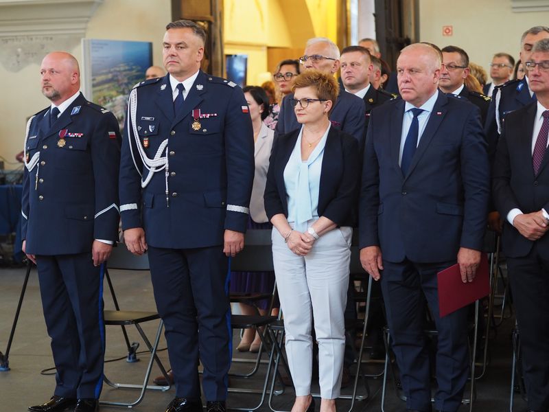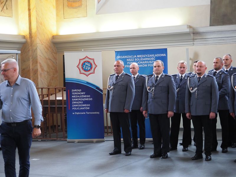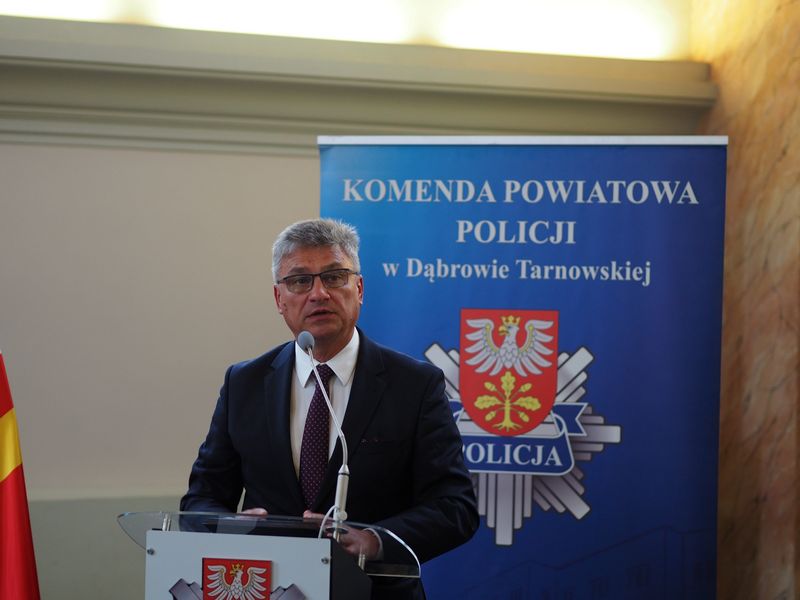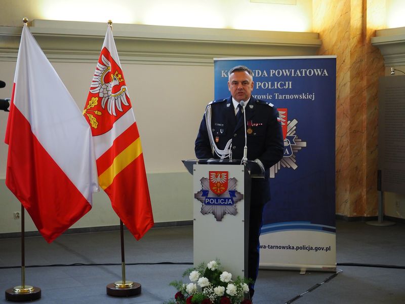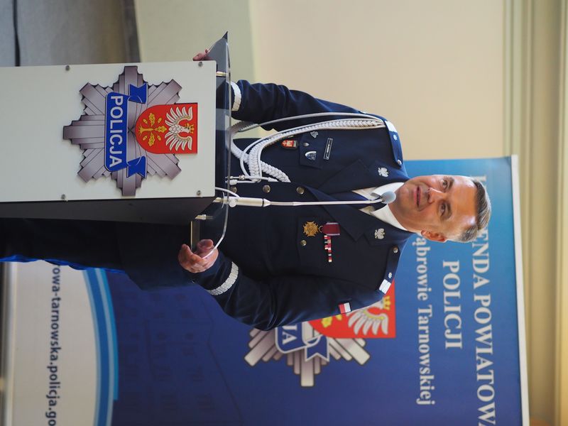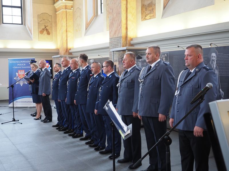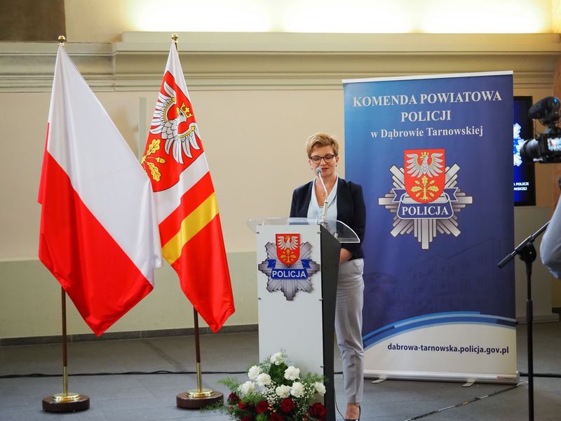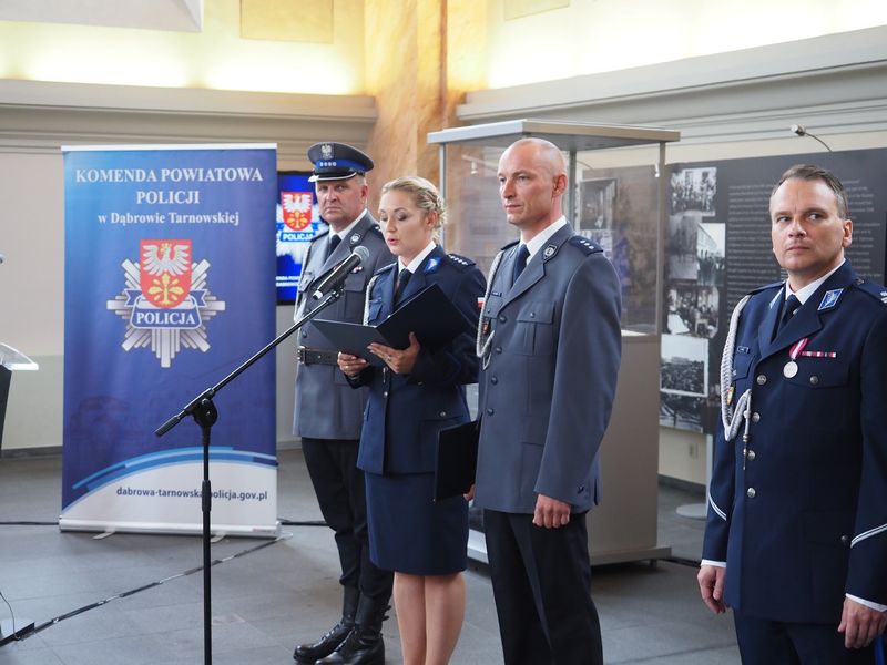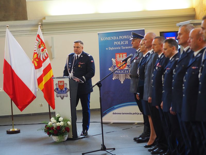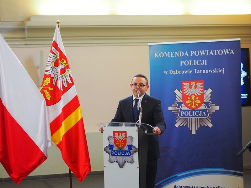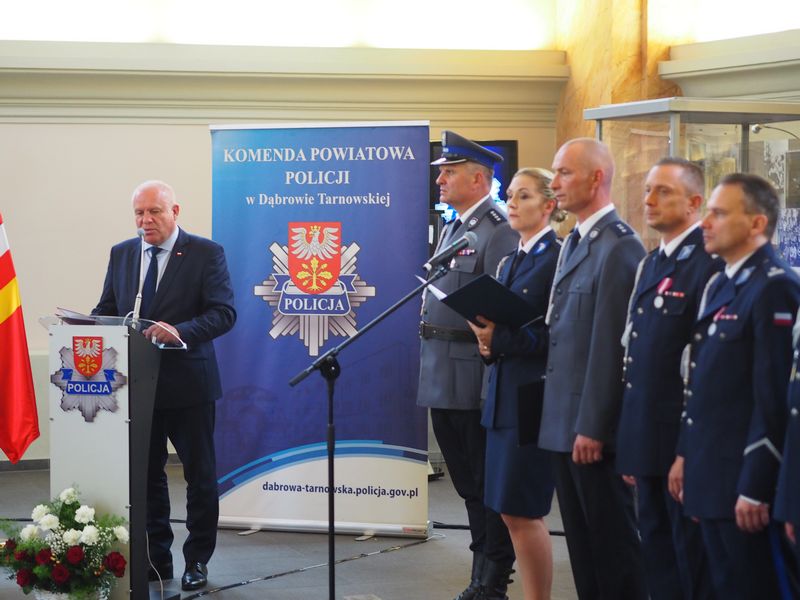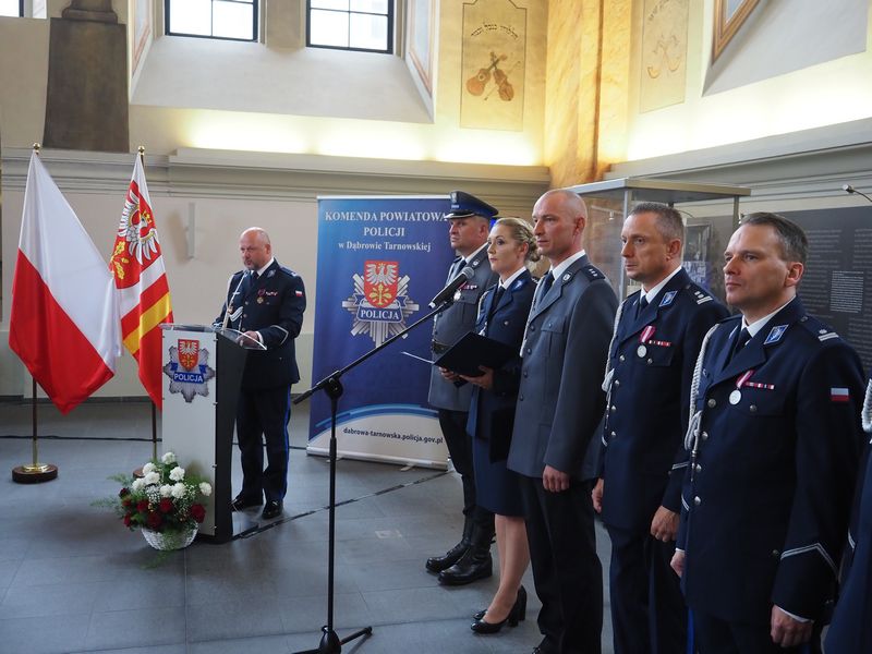 Powiatowe Obchody Święta Policji w Dąbrowie Tarnowskiej zorganizowane przez Komendanta Powiatowego Policji w Dąbrowie Tarnowskiej podinsp. Jarosława Kmiecia odbyły się w dniu 26 lipca br. w budynku Ośrodka Spotkania Kultur w Dąbrowie Tarnowskiej. W uroczystości udział wzięli m.in.: nadinsp. Michał Ledzion Komendant Wojewódzki Policji w Krakowie, Ryszard Pagacz – I Wicewojewoda Małopolski, Wiesław Krajewski – Poseł na Sejm Rzeczypospolitej Polskiej, Urszula Augustyn – Poseł na Sejm Rzeczypospolitej Polskiej, Piotr Sak – Poseł na Sejm Rzeczypospolitej Polskiej, insp. Bogusław Chmielarz – Komendant Powiatowy Policji w Brzesku, podkom. Dawid Herbut –Wiceprzewodniczący Zarządu Wojewódzkiego NSZZ Policjantów Województwa Małopolskiego, sierż.szt. Jacek Łukasik – Przewodniczący Komisji Międzyzakładowej NSZZ „Solidarność” Funkcjonariuszy i Pracowników Policji województwa małopolskiego w Nowym Sączu, ks. prof. dr hab. Stanisław Sojka Diecezjalny Duszpasterz Policji, Lesław Wieczorek – Starosta Dąbrowski, Krzysztof Kaczmarski – Burmistrz Dąbrowy Tarnowskiej, Jan Sipior– Burmistrz Miasta i Gminy Szczucin, przedstawiciele lokalnych gmin i instytucji na co dzień współpracujących z Komendą Powiatową Policji w Dąbrowie Tarnowskiej oraz wielu innych znamienitych gości.