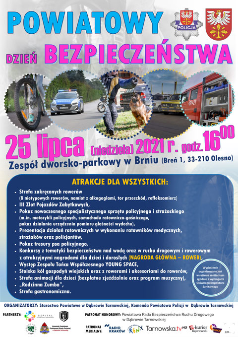 Starostwo Powiatowe w Dąbrowie Tarnowskiej wraz z Komendą Powiatową Policji w Dąbrowie Tarnowskiej serdecznie zapraszają na Powiatowy Dzień Bezpieczeństwa, który odbędzie się w niedzielę 25 lipca 2021 roku o godzinie 16:00 w zespole dworsko-parkowym w Brniu (Breń 1, 33-210 Olesno).