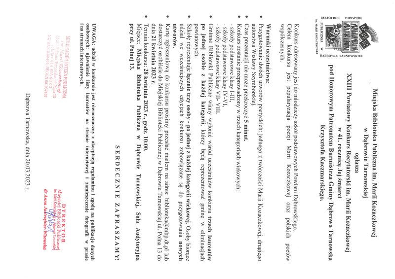 Miejska Biblioteka Publiczna w Dąbrowie Tarnowskiej ogłasza XXIII Powiatowy Konkurs Recytatorski im. Marii Kozaczkowej pod Honorowym Patronatem Burmistrza Dąbrowy Tarnowskiej Krzysztofa Kaczmarskiego.