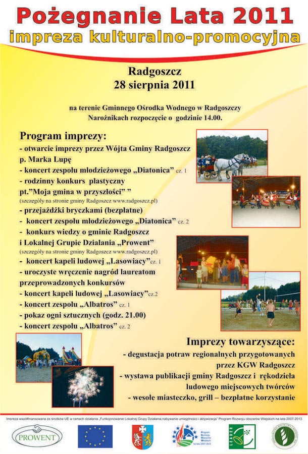 Pożegnanie lata 2011, impreza kulturalno -promocyjna. Radgoszcz 28 sierpnia, na terenie Gminnego Ośrodka Wodnego w Radgoszczy Narożnikach rozpoczęcie o godzinie 14:00