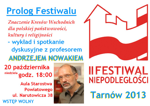 Już w najbliższą niedzielę 20 października o godz. 18:00 w Auli Starostwa Powiatowego w Tarnowie przy ul. Narutowicza 38 swój wykład – stanowiący równocześnie prolog II Festiwalu Niepodległości – wygłosi prof. Andrzej Nowak (UJ).