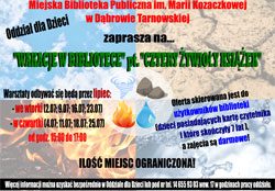 „CZTERY ŻYWIOŁY KSIĄŻEK” pod takim hasłem już wkrótce w Oddziale dla Dzieci ruszą zajęcia dla dzieci w wieku od 7 do 12 lat, będących użytkownikami Miejskiej Biblioteki Publicznej w Dąbrowie Tarnowskiej w ramach „WAKACJI W BIBLIOTECE”.