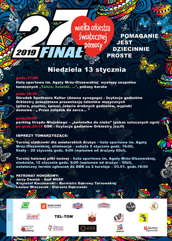 Finał odbędzie się w Dąbrowie 13 stycznia pod hasłem „Pomaganie jest dziecinnie proste, ale granie się już rozpoczęło na dobre turniejem siatkówki 5 stycznia, w którym zwyciężyła drużyna MUKS „Bilard” UKS z Tarnowa. Niedzielne świętowanie poprzedzi drugi z zaplanowanych turniejów sportowych zorganizowanych przez DDK – sztab WOŚP z Referatem Sportu i Kultury Fizycznej Urzędu Miejskiego w Dąbrowie Tarnowskiej (Hala Sportowa im. Agaty Mróz-Olszewskiej – sobota 12.01 godz.9:00). Na turniej zgłosiło się 10 drużyn, rywalizacja o puchary i indywidualne trofea (dla „króla strzelców” i najlepszego bramkarza) zapowiada się bardzo interesująco.