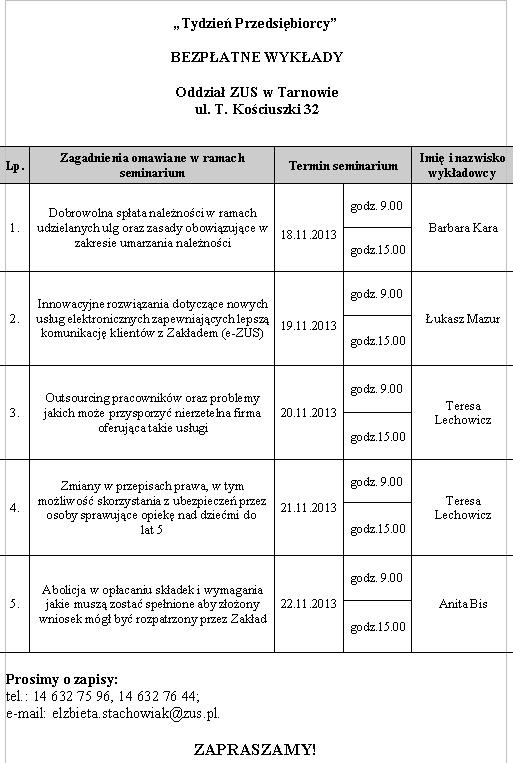 Natomiast na specjalnych seminariach tematycznych dowiemy się między innymi o tym, jak efektywnie korzystać z nowej wersji programu Płatnik i dlaczego warto skonfigurować w firmowym laptopie Platformę Usług Elektronicznych, czyli jak rozliczać się z ZUS bez wizyty w urzędzie. Będzie można także sprawdzić na jakich zasadach można skorzystać z ulg i umorzeń w spłacie zaległych składek oraz z abolicji składkowej. Warto również porozmawiać o tym, jak nie dać nabrać się na „usługi” nieuczciwych pośredników oferujących outsourcing pracowników. Wykłady będą się odbywać w siedzibie Oddziału ZUS w Tarnowie. Prosimy o wcześniejsze zgłaszanie chęci udziału. Numer sali zostanie podany uczestnikom w późniejszym terminie.