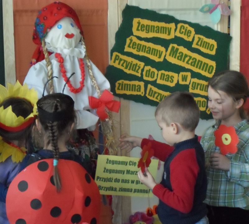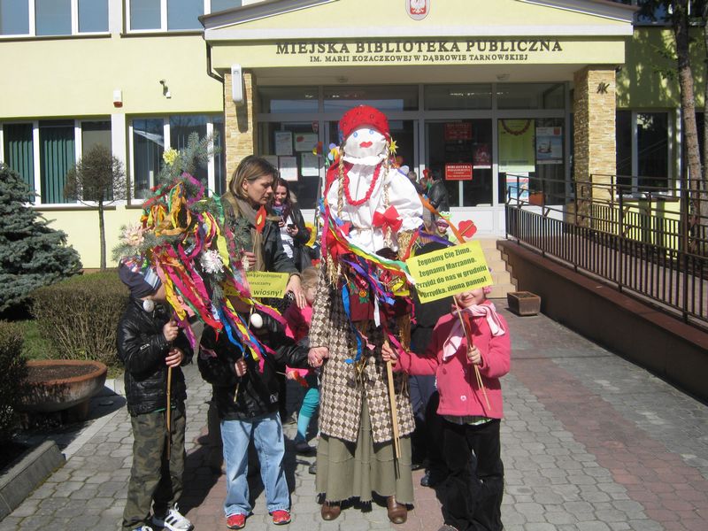 Dąbrowscy przedszkolacy podczas spotkania w bibliotece mieli możliwość zobaczyć tradycyjną Marzannę oraz Gaik Maik i w ich towarzystwie wziąć udział w barwnym korowodzie po ulicach naszego miasta. Zanim jednak to nastąpiło w sali odbyło się radosne śpiewanie wiosennych piosenek, pogadanka o wiosennych tradycjach, a przede wszystkim głośne czytanie wierszy polskich autorów.