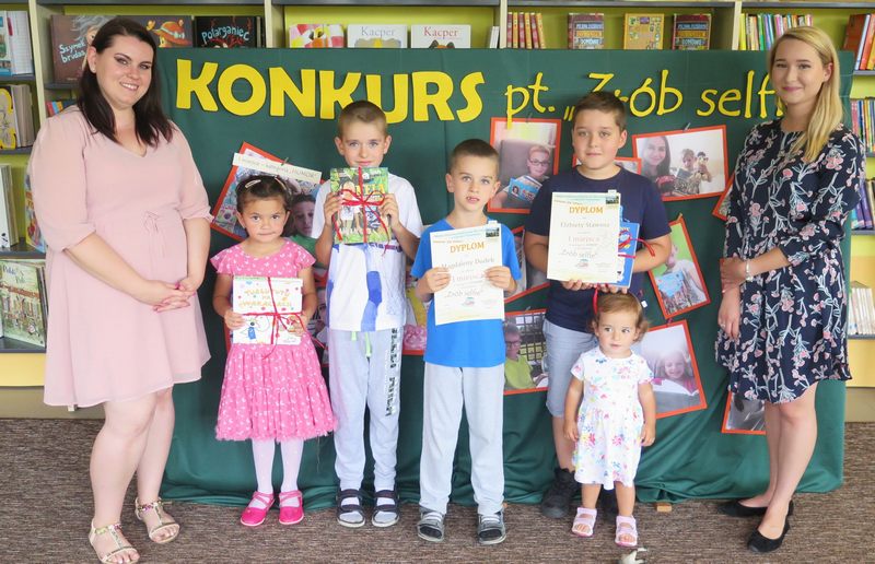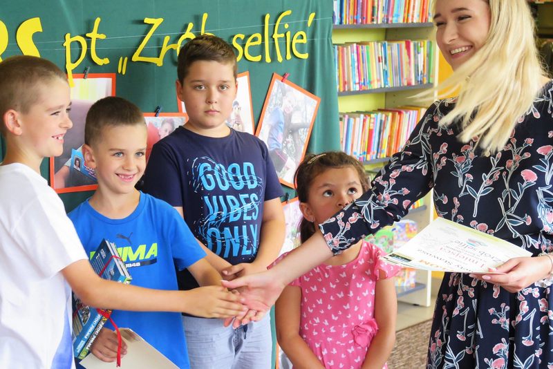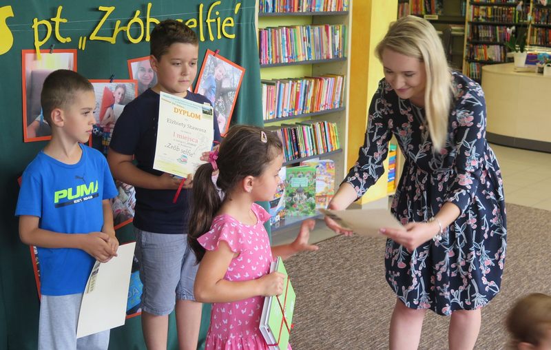 Uroczyste wręczenie książek i dyplomów z rąk przewodniczącej komisji pani Aleksandry nastąpiło w otoczeniu wystawy skomponowanej ze zdjęć konkursowych, z którymi można zapoznać się nie tylko na profilu facebooko’owym biblioteki, ale również w wersji papierowej w Oddziale dla Dzieci do 13 września br. Spotkanie zakończyło wspólne selfie z laureatami.