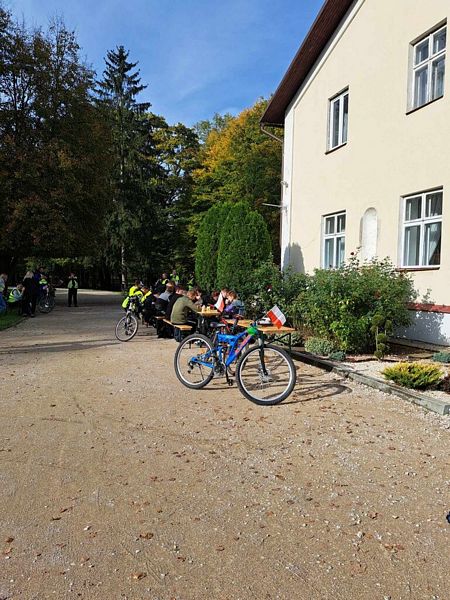 Trasa przejazdu obejmowała również zespół dworsko – parkowy w Brniu, gdzie w Centrum Polonii – Ośrodku Kultury, Turystyki i Rekreacji w Brniu wszyscy rowerzyści odpoczęli, zjedli posiłek i zregenerowali siły na powrót do Szczucina.