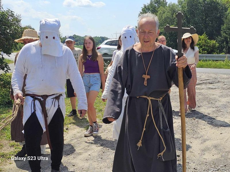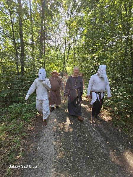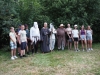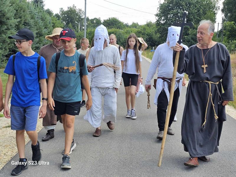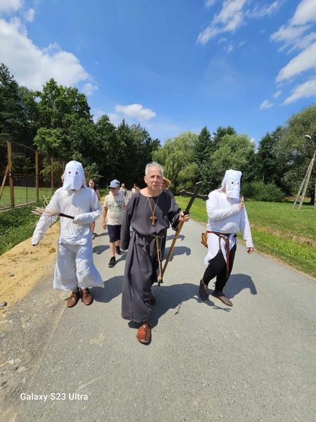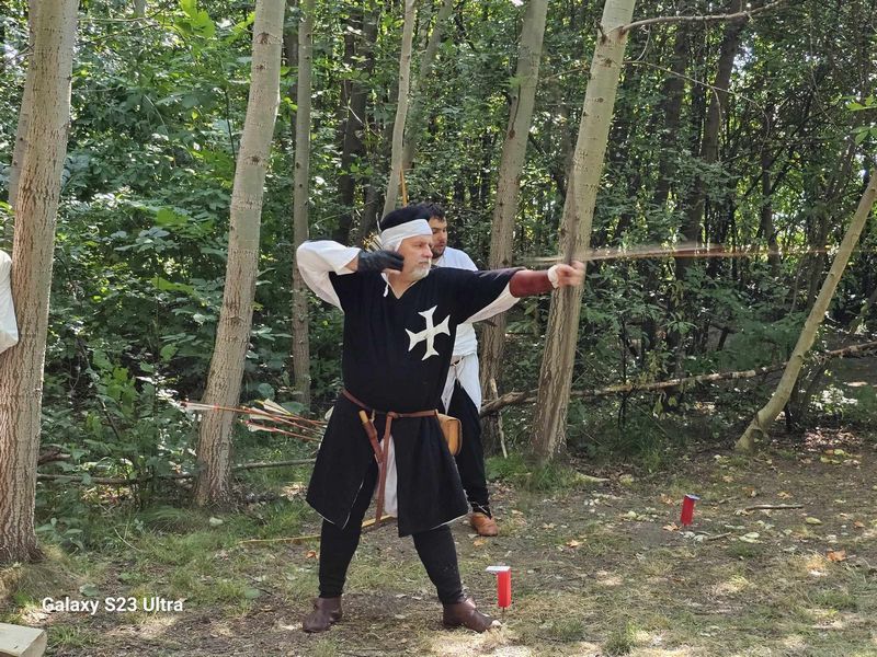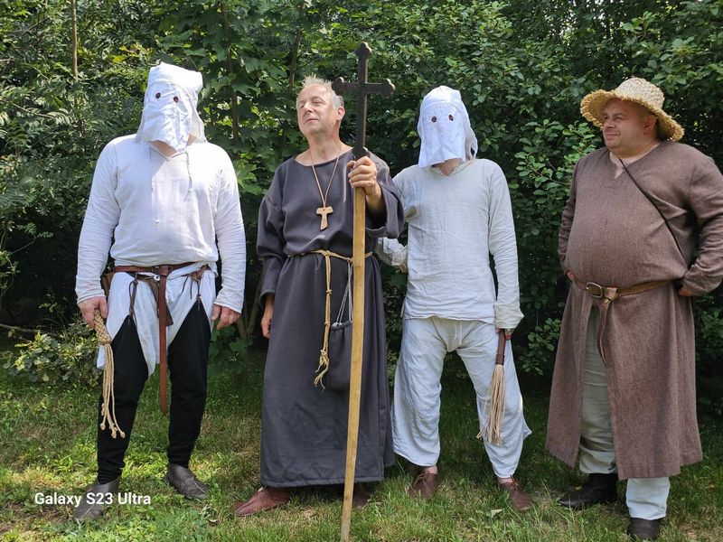 Albowiem rok po rozgromieniu zdrajców pod Bogucinem Małym władca nagrodził nas sowicie i wyprawić turniej i ucztę wielką z tańcami należało. Na zaproszenie kasztelana przybyło rycerstwo i łucznicy wybitni ze wszystkich dzielnic a i damy nadobne. Z nieodległego krakowskiego grodu gdzie nasz darczyńca na tronie zasiada, zjechała trupa grajków Żmijem się mianująca i kramy rzemieślników wszelakich. Toteż gawiedzi chętnej darmowych igrców zakosztować nie zabrakło i plac turniejowy wraz z traktami okolicznymi szybko się zapełnił. By w czasach pokoju rycerstwo swego kunsztu nie zapomniało rozegrano potyczek wiele…O zwycięstwach rozsądzał Piotr Parka „Banditem”zwany- dowódca hufca krakowsko-sandomierskiego, pod którego sztandarem Poczet Bagiennych z Wieżycy miejsce godne znalazł. W bojach samojeden ciężkozbrojnych zwycięzcą został Sławek z Lipowca co za swą wolę walki miecz od kasztelana otrzymał, zaś wśród lekko zbrojnych prym wiódł Przemysław Misiuda. W potyczkach grupowych wygrała drużyna Janka, w miotaniu oszczepem najlepszym okazał się brat Ireneusz z Podleszan a w łucznictwie najcelniejszym Grzegorz Lasota. Najsprawniej w biegu dam poradziła sobie Gabriela z solnego, bocheńskiego grodu. Na koniec zaś, ku uciesze gawiedzi zbójcerze przymuszani przez swego herszta Bandita, gród bagienny dwakroć zdobywali, by niebawem z pokonanymi u boku kasztelana do uczty zasiąść. By grzeszne igrce i biesiadne obżarstwo odpokutować, dnia następnego ruszył ku najbliższej kaplicy marsz biczowników…
