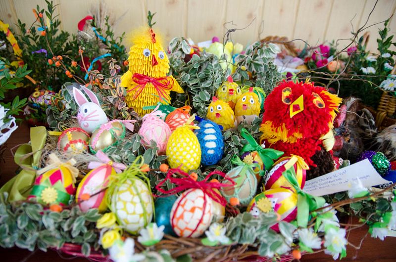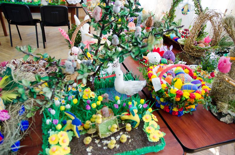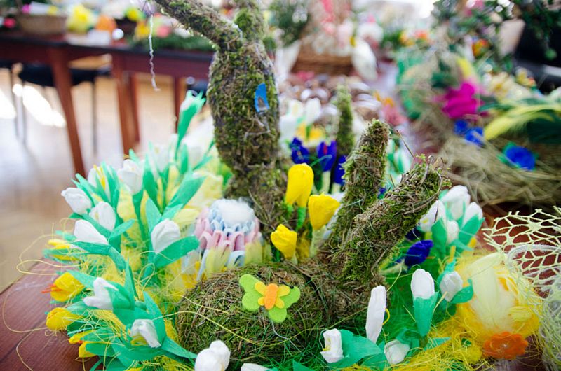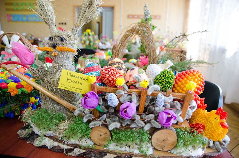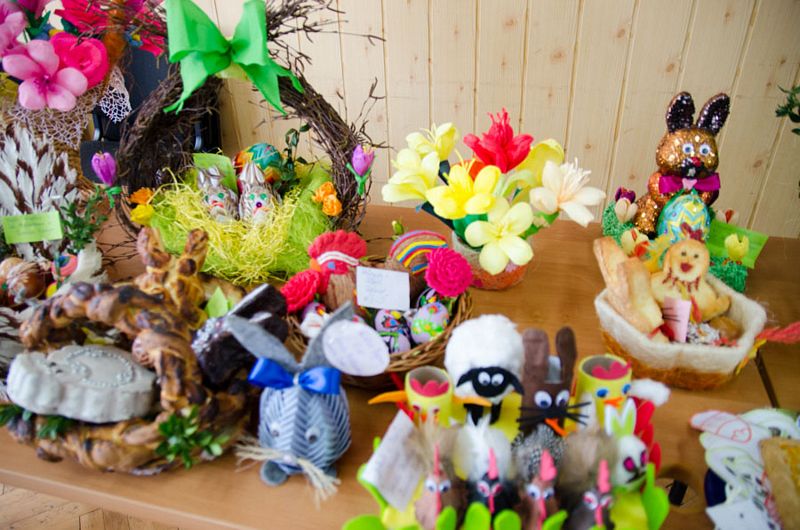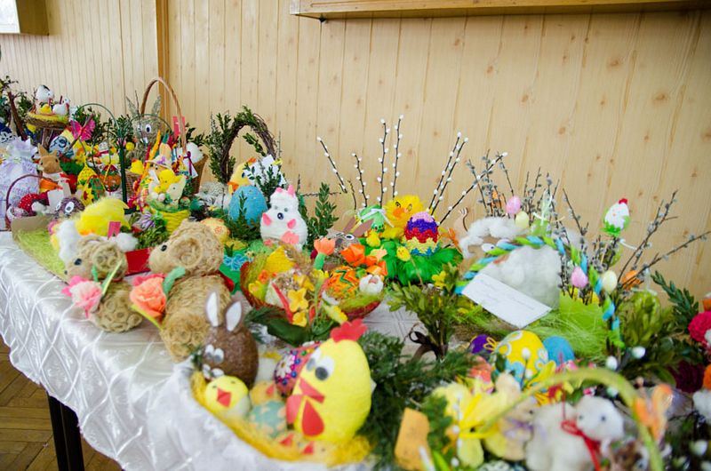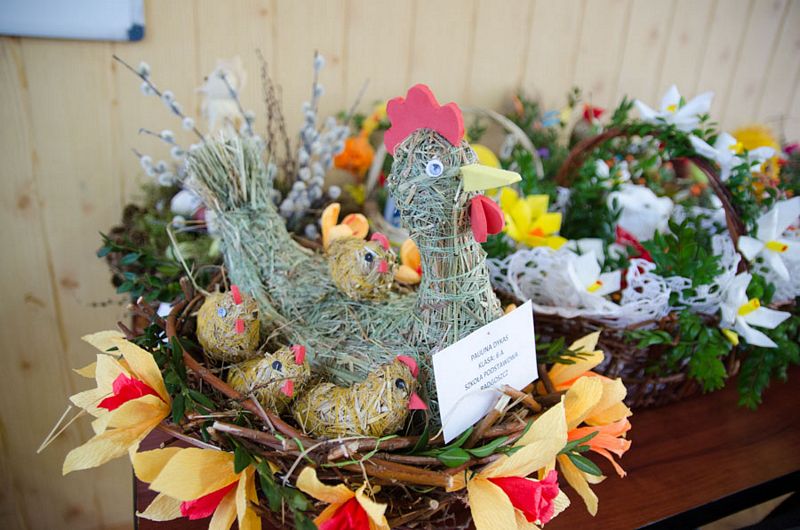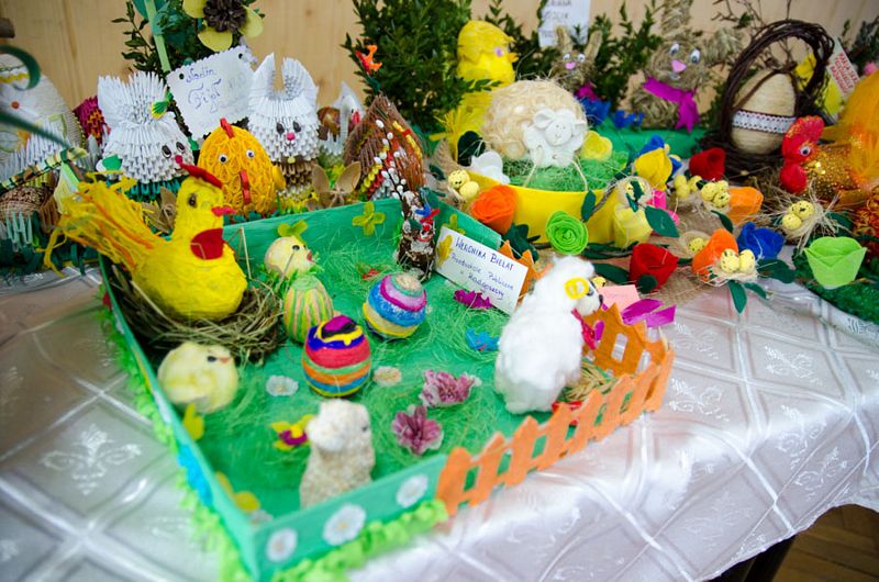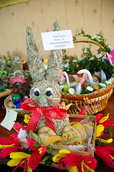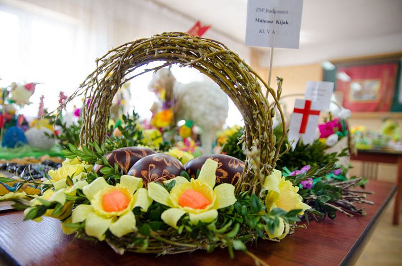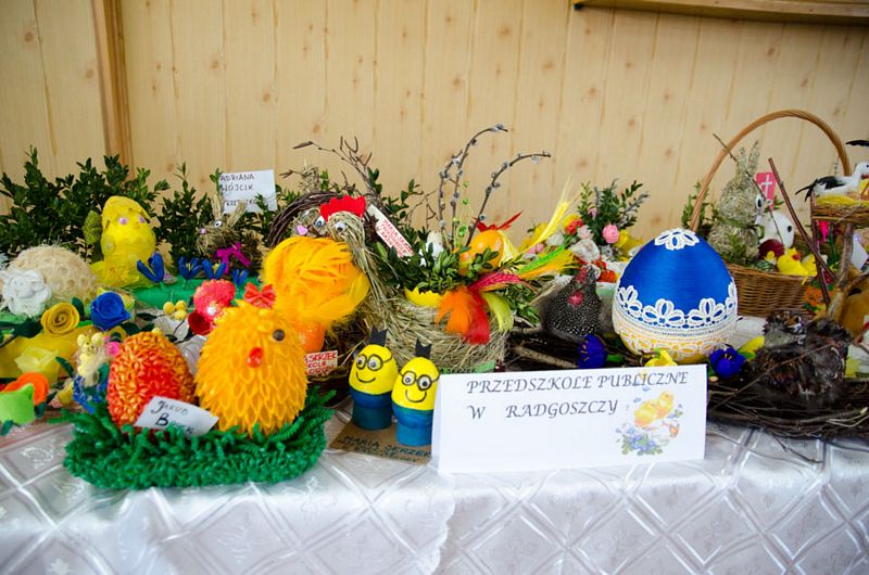 Uczniowie szkół i przedszkoli z Radgoszczy, Luszowic, Łęgu, Małca i Zarzecza Dużego przygotowali: pisanki zdobione techniką tradycyjną, wypieki, stroiki, gaiki, kompozycje kwiatowe, wyroby szydełkowe.