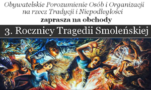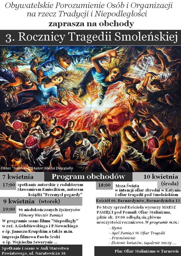 Obywatelskie Porozumienie Osób i Organizacji na rzecz Tradycji i Niepodległości zaprasza mieszkańców Tarnowa i okolic do wzięcia udziału w przygotowywanych obchodach 3. Rocznicy Tragedii Smoleńskiej i 73. Rocznicy Ludobójstwa w Katyniu.