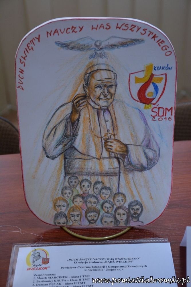 Wszystkim uczestnikom IX Regionalnego konkursu poświęconego wartościom głoszonym przez świętego Jana Pawła II pn. „Bądź Wielkim” dziękujemy za przystąpienie do tego pięknego, a jednocześnie wymagającego konkursu poświęconego naszemu Wielkiemu Rodakowi – św. Janowi Pawłowi II.