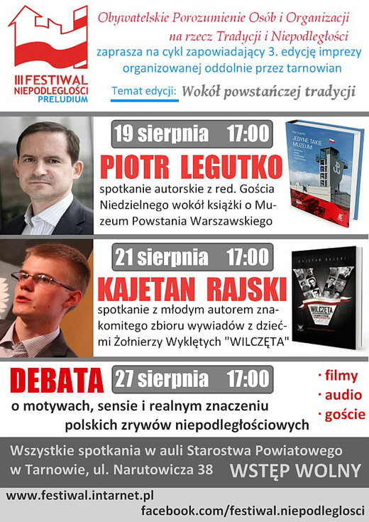 Tradycyjnie już pod koniec października w Tarnowie planowane są koncerty, debaty, przegląd filmowy, wykłady … Pierwszymi akcentami tegorocznej edycji będą jednak sierpniowe spotkania autorskie poświęcone w całości percepcji dwóch ostatnich polskich zbrojnych zrywów niepodległościowych, których pamięć przywracana jest nareszcie narodowej tożsamości.