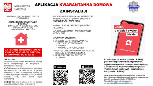 „Szybsza komunikacja ze służbami i lepsza opieka dla osób objętych kwarantanną – to główny cel aplikacji Kwarantanna domowa. Wysłanie zdjęcia zamiast wizyty policjantów – tak, dzięki naszej aplikacji, może wyglądać kwarantanna domowa. Aplikacja jest darmowa, bezpieczna i dostępna w sklepach Google Play i App Store. Właśnie rozpoczęliśmy proces jej udostępniania” – głosi komunikat Ministerstwa Cyfryzacji.