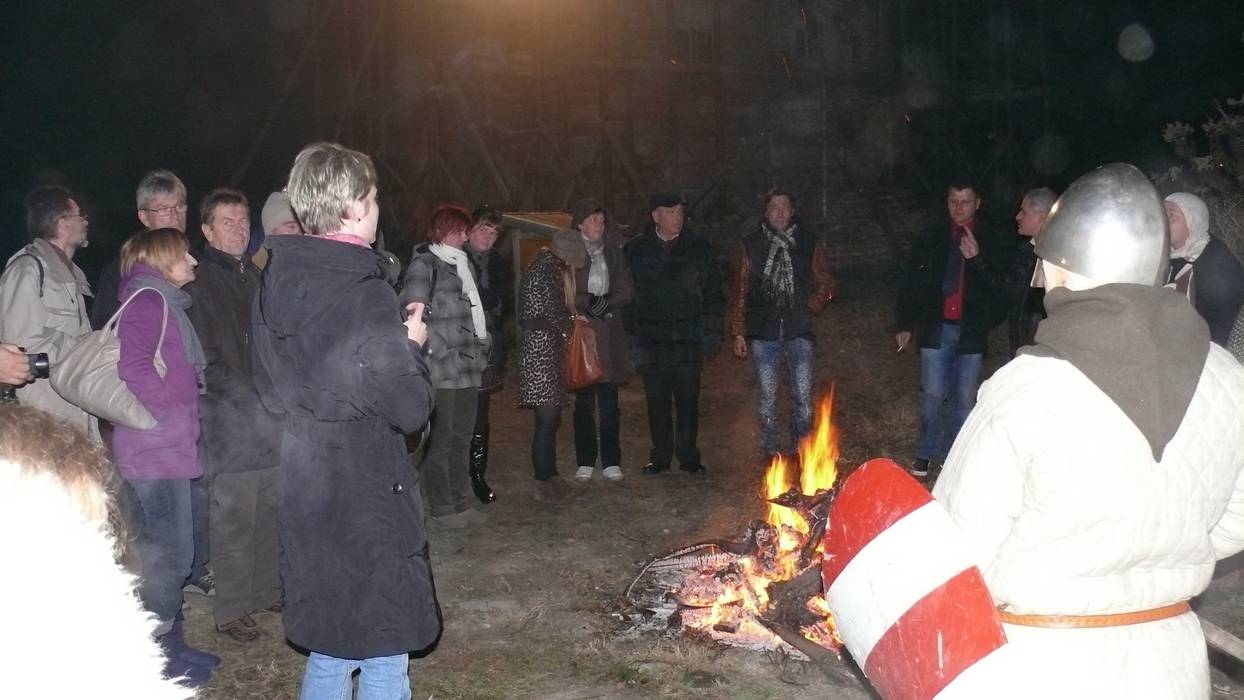 Tutejszy grododzierżca wraz z małżonką toczyli dysputę z siostrą klaryską do chwili gdy nadciągnął księże Sławomir  z Tarnowa wraz ze zbrojnymi.  To oni uświetnić mieli pokazem walk rycerskich przybycie gości z odległych krain. Refleksy ognia pełzały po ich hełmach i mieczach poruszających się w takt zadawania i parowania ciosów. Wreszcie przyszedł czas na oprowadzanie gości po  komnatach czterokondygnacyjnej wieży wypełnionych drgającymi światłami świec. Na koniec  grododzierżca z eskortą odprowadził przybyłych do głównego gościńca, którym podążyli w dalszą podróż.