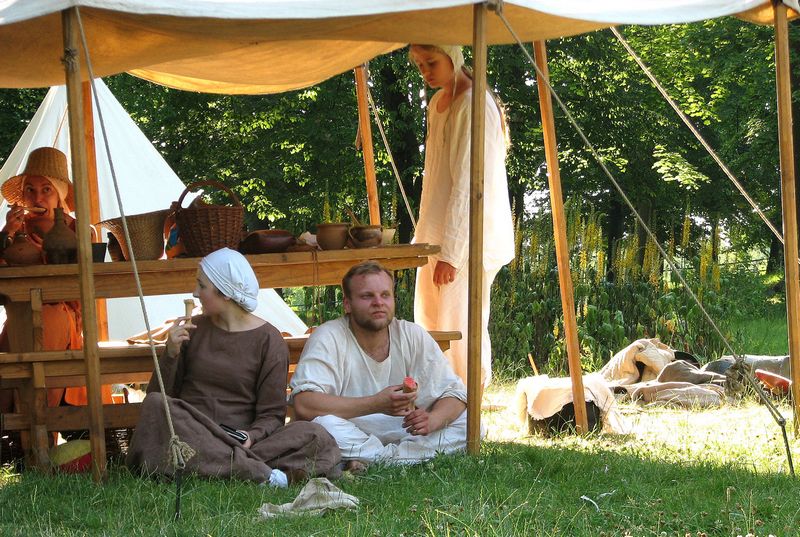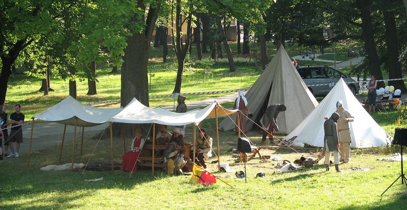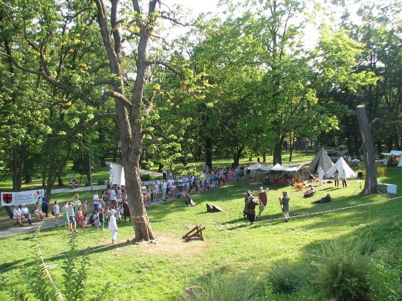 Bezlitosny skwar nie przeszkodził wojom z Tarnowskiego Bractwa Rycerskiego „Gladii Amici” w rozbiciu średniowiecznego obozowiska w dąbrowskim parku, nieopodal „góry zamkowej”.