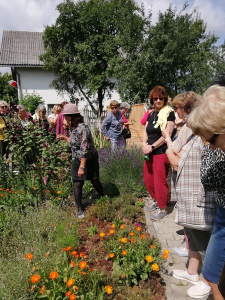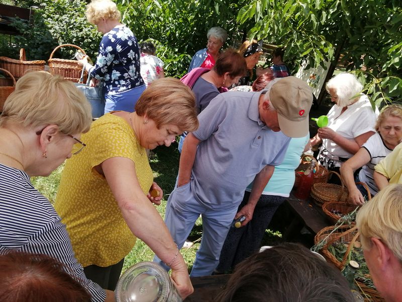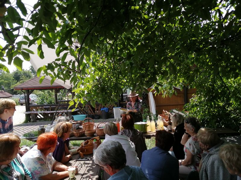 Seniorzy wzięli udział w spacerze edukacyjnym, podczas którego zapoznali się z różnymi rodzajami ziół oraz ich właściwościami. Uczyli się rozpoznawania roślin, a także dowiadywali się, jak poszczególne zioła wykorzystywane są w medycynie ludowej, farmakologii i kosmetologii. Dużym zainteresowaniem słuchaczy cieszyły się warsztaty, w trakcie których mogli zaobserwować, jak w warunkach domowych można wytwarzać ocet jabłkowy oraz przetwory na jego bazie. Wszyscy uczestnicy warsztatów otrzymali buteleczkę z gotowym octem oraz sami sporządzali zaczyn nowego produktu według własnej receptury, z wykorzystaniem różnych ziół oraz octu. Na podkreślenie zasługuje sposób prezentacji prowadzącej zajęcia Pani Stefanii, jej ogromna wiedza oraz pasja z jaką potrafiła – piękną polszczyzną – opowiadać o ziołach, ich walorach zdrowotnych, smakowych i zapachowych. Był także poczęstunek dla uczestników warsztatów.