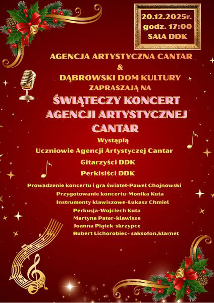 Koncert „W przedświątecznym nastroju” z udziałem muzyków i wokalistek związanych z Agencją Artystyczną „Cantar” (Monika Kuta) i jej gości to wprowadzenie w nastrój zadumy i radosnego oczekiwania na Boże Narodzenie.