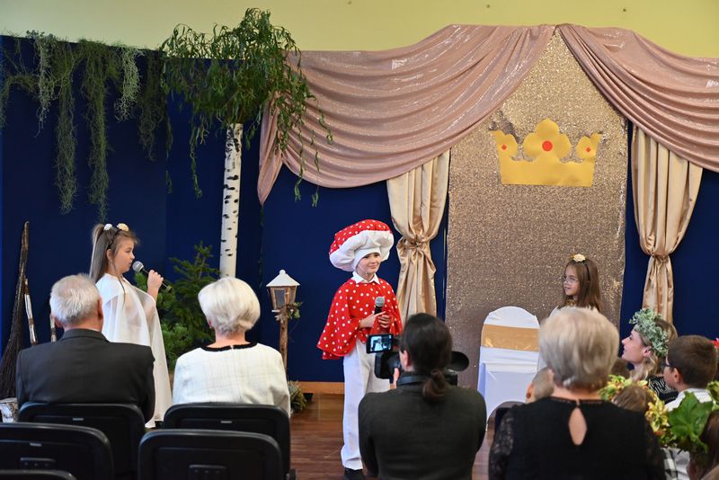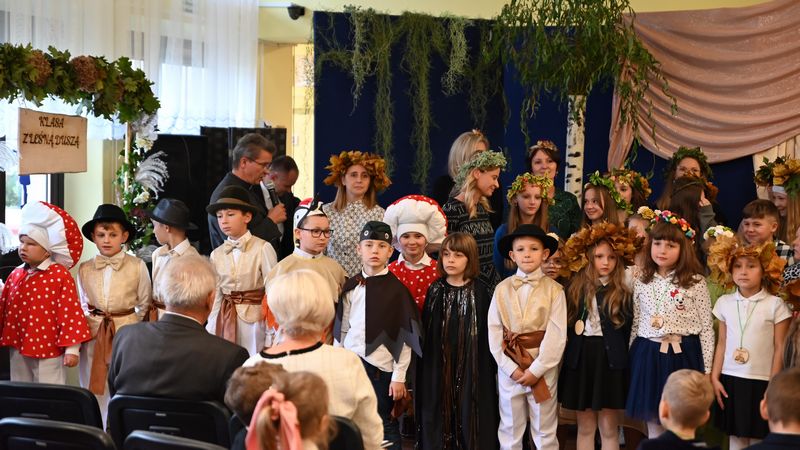 Imprezę wzbogaciły występy artystyczne: przedstawienie o mieszkańcach lasu i konieczności dbania o leśną przyrodę, taniec leśnych duszków i muchomorków przygotowany przez najmłodszych uczniów naszej szkoły oraz brawurowo wykonana „Pieśń Lasu” przez uczniów, rodziców i nauczycieli.
