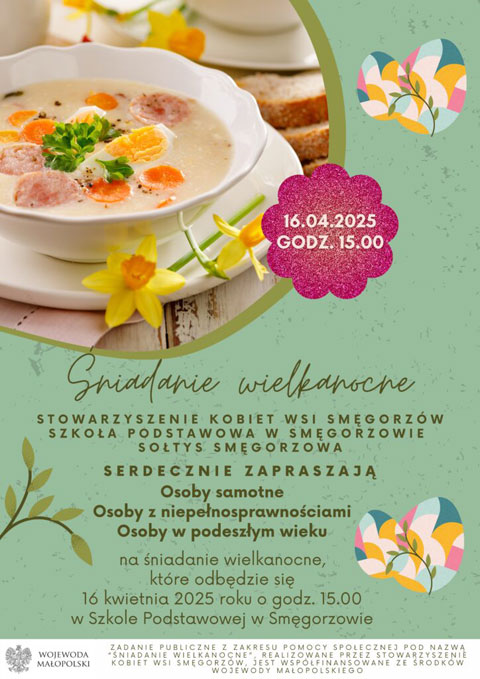 Stowarzyszenie Kobiet Wsi Smęgorzów organizuje 16 kwietnia br. o godz. 15:00 w Szkole Podstawowej w Smęgorzowie „Śniadanie Wielkanocne” dla osób znajdujących się w szczególnie trudnej sytuacji życiowej.