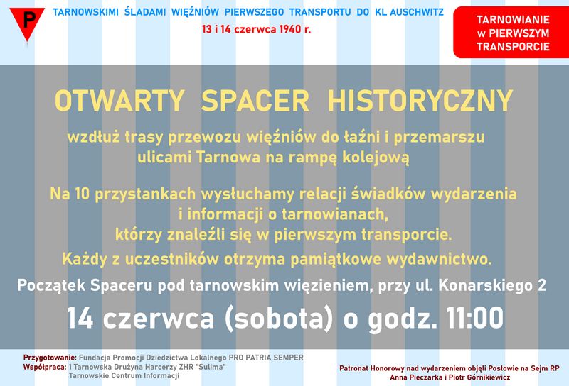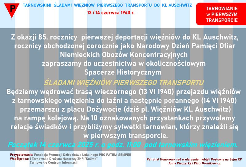 Fundacja Promocji Dziedzictwa Lokalnego PRO PATRIA SEMPER oraz 1 Tarnowska Drużyna Harcerzy ZHR „Sulima” zapraszają do udziału w otwartym Spacerze Historycznym „Tarnowskimi śladami więźniów pierwszego transportu do KL Auschwitz”.