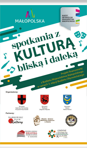 Pięć instytucji kultury z terenu trzech gmin: Dąbrowy Tarnowskiej (Dąbrowski Dom Kultury), Radłowa (Gminne Centrum Kultury i Czytelnictwa) i Żabna (Miejsko-Gminna Biblioteka Publiczna i Gminne Centrum Kultury) rozpoczyna realizację zadania „Spotkania z kulturą bliską i daleką” w ramach III edycji Budżetu Obywatelskiego Województwa Małopolskiego.