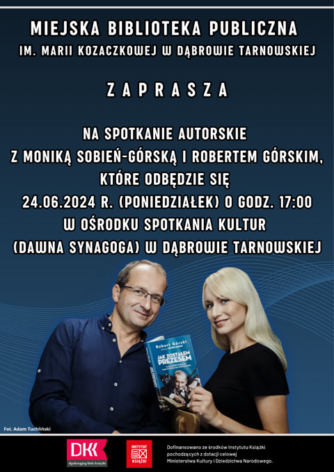 Miejska Biblioteka Publiczna zaprasza na spotkanie autorskie z Moniką Sobień-Górską i Robertem Górskim, które odbędzie się 24.06.2024 roku o godzinie 17:00 w Ośrodku Spotkania Kultur (dawna Synagoga) w Dąbrowie Tarnowskiej.