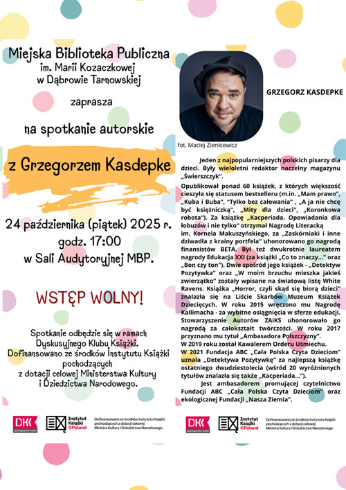 Dokładnie 12 lat temu w Miejskiej Bibliotece Publicznej w Dąbrowie Tarnowskiej goszczono pisarza Grzegorza Kasdepke i tym większą radość sprawia jego powrót w progi dąbrowskiej książnicy już w piątek 24 października br. o godz. 17:00.
