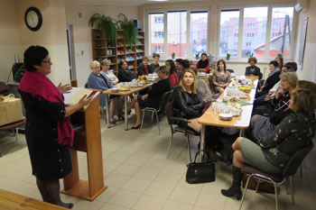 Po przywitaniu, dyrektor MBP a jednocześnie Przewodnicząca Dąbrowskiego Koła Jadwiga Kusior, zaprosiła do zaprezentowania sprawozdania z obchodów 100-lecia SBP w Oddziale Krakowskim oraz zmian po wyborach w SBP w Warszawie.