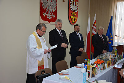 Następnie podsumował mijający 2015 rok oraz podziękował pracownikom Starostwa Powiatowego za zaangażowanie w realizację zadań w ciągu całego roku. Nie zabrakło też ciepłych słów skierowanych do ks. Proboszcza, Wicestarosty Dąbrowskiego Marka Kopii, Skarbnik Powiatu Marii Sztorc, Sekretarza Powiatu Joanny Ohratki oraz obecnego na spotkaniu Dyrektora Powiatowego Urzędu Pracy Stanisława Początka. Złożył wszystkim obecnym życzenia noworoczne. Życzenia i podziękowania złożył również Ks. Proboszcz Stanisław Cyran, po czym pobłogosławił opłatki.