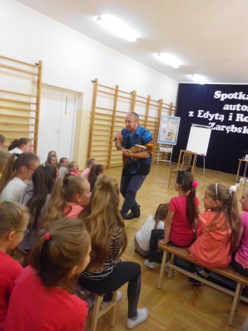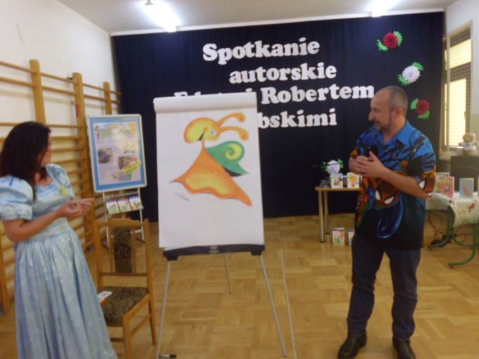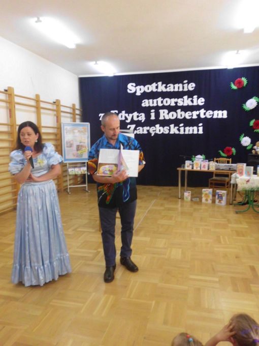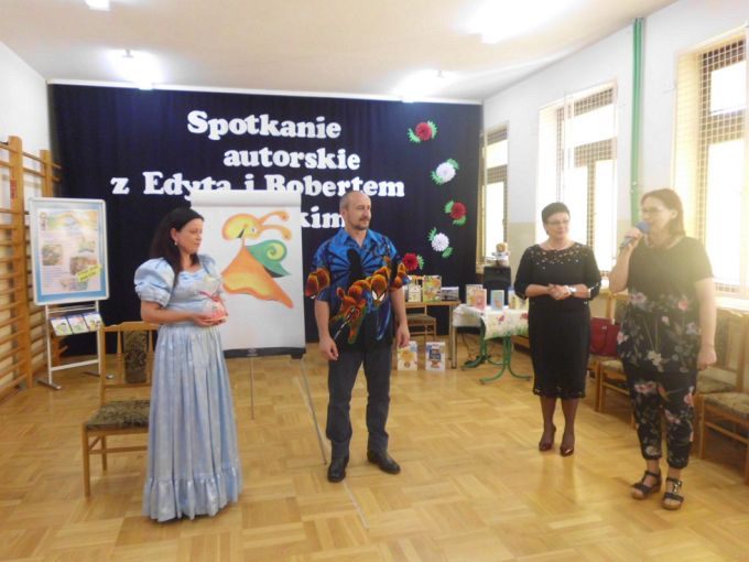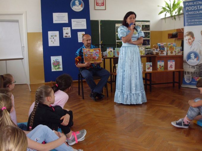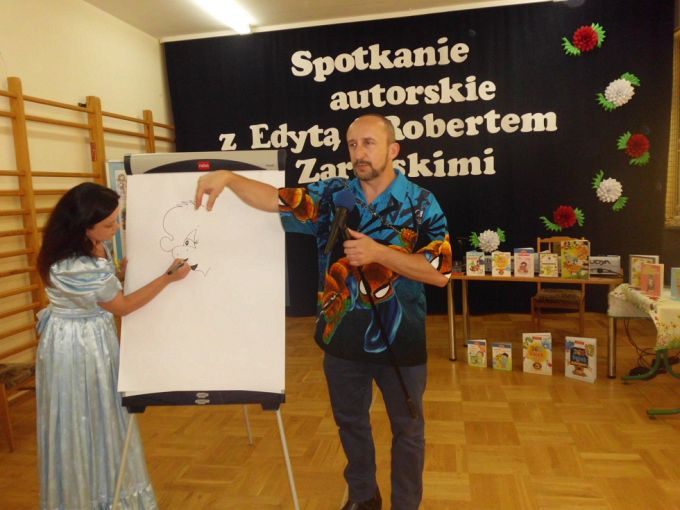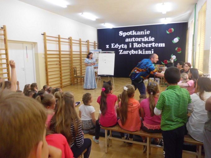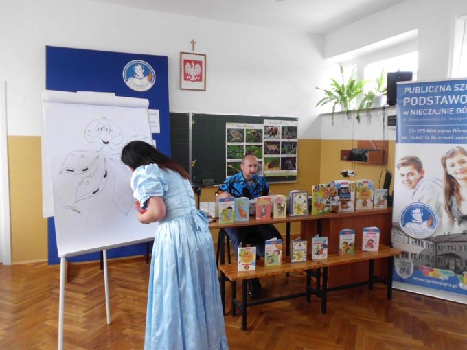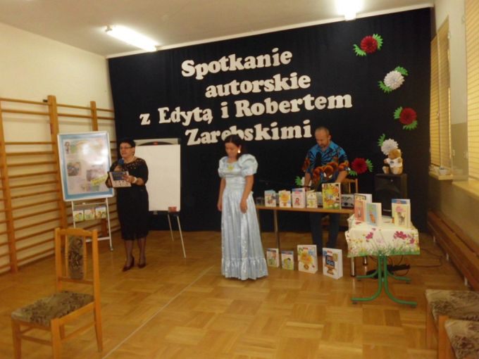 Pani Edyta Zarębska maluje obrazy oraz pisze książki dla dzieci. Swoją literacką karierę rozpoczęła wierszem i własnoręcznie ozdobioną książką „Opowieści babci Gruni”. Jest autorką książek m.in. z serii „Pierwsze czytanki”: „Antek i stara jabłoń” oraz „Zosia i fiołkowy kapelusz” przeznaczonych dla najmłodszych rozpoczynających naukę czytania. Autorka wystąpiła w pięknym, baśniowym stroju. Podczas spotkań opowiadała o swoich marzeniach i przygodach z dzieciństwa będących inspiracją dla jej twórczości literackiej. Uczniowie mieli, dzięki zdolnościom Pani Edyty możliwość obserwowania jak powstaje ilustracja do książki. No i cóż się okazało… ze skromnych początkowo kresek wyłoniła się najpierw myszka, a potem prześliczny ślimak i ośmiorniczka. Do wspólnej zabawy włączył się również Pan Robert, który przeczytał bajkę, a następnie zaśpiewał piosenkę przy akompaniamencie instrumentu klawiszowego. Dzieci śpiewały i klaskały do rytmu. Należy podkreślić, że piosenka pt. „Mądra rzeka ” napisana została specjalnie dla bibliotek i o bibliotekach. Rewelacyjne spotkania przebiegły w miłej atmosferze i były okazją do zainteresowania małych czytelników Biblioteką i czytelnictwem. Zaproszeni goście udowodnili, że marzenia się spełniają, a kluczem do ich realizacji jest wiedza ukryta w książkach. Serdecznie dziękujemy Dyrektorom Szkół Podstawowych w Nieczajnie Górnej i Szarwarku za pomoc przy realizacji projektu.