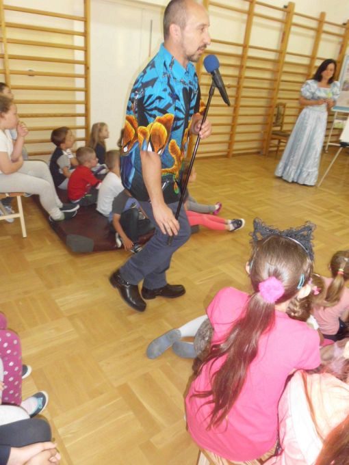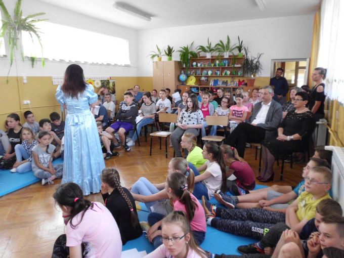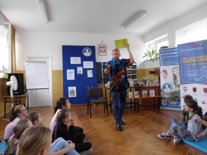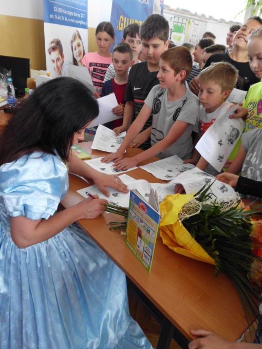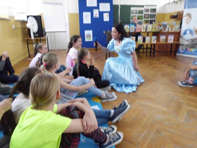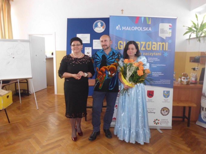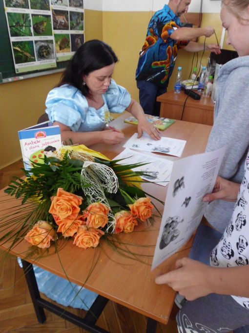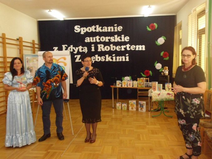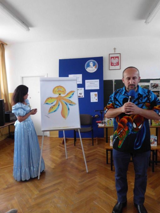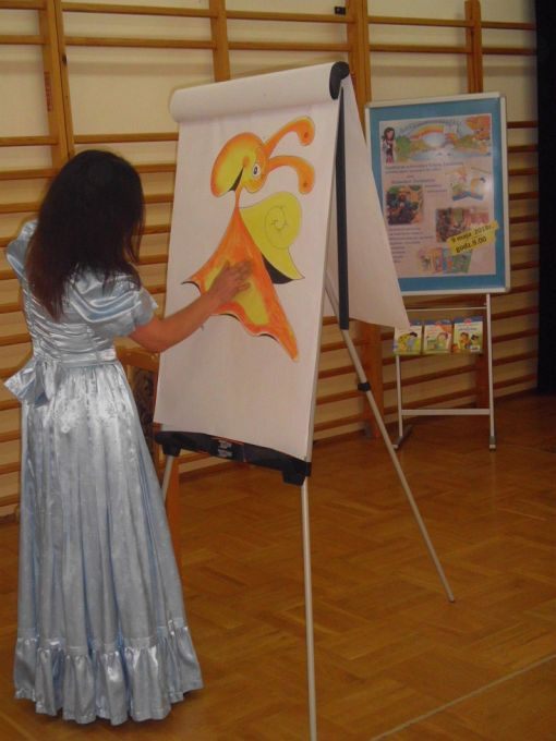 Pani Edyta Zarębska maluje obrazy oraz pisze książki dla dzieci. Swoją literacką karierę rozpoczęła wierszem i własnoręcznie ozdobioną książką „Opowieści babci Gruni”. Jest autorką książek m.in. z serii „Pierwsze czytanki”: „Antek i stara jabłoń” oraz „Zosia i fiołkowy kapelusz” przeznaczonych dla najmłodszych rozpoczynających naukę czytania. Autorka wystąpiła w pięknym, baśniowym stroju. Podczas spotkań opowiadała o swoich marzeniach i przygodach z dzieciństwa będących inspiracją dla jej twórczości literackiej. Uczniowie mieli, dzięki zdolnościom Pani Edyty możliwość obserwowania jak powstaje ilustracja do książki. No i cóż się okazało… ze skromnych początkowo kresek wyłoniła się najpierw myszka, a potem prześliczny ślimak i ośmiorniczka. Do wspólnej zabawy włączył się również Pan Robert, który przeczytał bajkę, a następnie zaśpiewał piosenkę przy akompaniamencie instrumentu klawiszowego. Dzieci śpiewały i klaskały do rytmu. Należy podkreślić, że piosenka pt. „Mądra rzeka ” napisana została specjalnie dla bibliotek i o bibliotekach. Rewelacyjne spotkania przebiegły w miłej atmosferze i były okazją do zainteresowania małych czytelników Biblioteką i czytelnictwem. Zaproszeni goście udowodnili, że marzenia się spełniają, a kluczem do ich realizacji jest wiedza ukryta w książkach. Serdecznie dziękujemy Dyrektorom Szkół Podstawowych w Nieczajnie Górnej i Szarwarku za pomoc przy realizacji projektu.