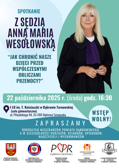 Ww. spotkanie z sędzią Anną Marią Wesołowską jest jednym z czterech jakie odbędzie się na terenie powiatu dąbrowskiego w dniach 22 i 23 października 2025 r. Uczestnikami kolejnych spotkań, organizowanych w ramach Dni Profilaktyki Powiatu Dąbrowskiego, będą uczniowie klas 7-8 szkół podstawowych, uczniowie szkół ponadpodstawowych, a także m.in. dyrektorzy szkół i przedszkoli, pedagodzy, psycholodzy, przedstawiciele ośrodków pomocy społecznej, Policji, władz samorządowych, instytucji i stowarzyszeń.