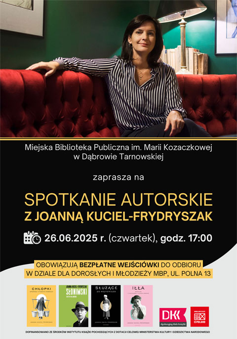 Już dzisiaj z wielką radością Miejska Biblioteka Publiczna im. Marii Kozaczkowej w Dąbrowie Tarnowskiej zaprasza wszystkich zainteresowanych na spotkanie autorskie z Joanną Kuciel-Frydryszak, które odbędzie się 26.06.2025 r. (czwartek) o godz. 17:00.
