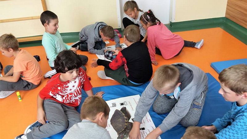 Dnia 22.09.2017 roku przystąpiliśmy do realizacji pierwszego zadania. Wszystkie kroki z tego zadania przeszliśmy z wykorzystaniem laptopa i rzutnika multimedialnego. Na wstępie zapoznaliśmy się z głównymi bohaterami: Julką, Kubą oraz Psotnikiem. Realizując krok pierwszy dzieci pomogły ocenić Kubie, czy dokonał słusznego wyboru, decydując się na zakup żółwia. Następnie układały pytania dotyczące tego, co powinni wiedzieć Julka i Kuba zanim zaczną hodować wybrane zwierzątko. Potem przystąpiliśmy do realizacji kroku drugiego, zastanawialiśmy się skąd Julka i Kuba uzyskają potrzebne informacje na temat żółwia. Uczniowie zabrali się do odszukania wymyślonych przez siebie pytań na otrzymanych krateczkach i dopasowywali do nich różne źródła informacji (karteczki z symbolem źródła informacji). Realizując krok trzeci żwawo przystąpiliśmy do rozwiązania problemu, by pomóc głównym bohaterom. Julka i Kuba nie mogli zdecydować się, z którego źródła skorzystać, dlatego dzieci doradziły, że warto czasem uwzględnić kilka źródeł informacji, aby uzyskać rzetelną relację. Dla utrwalenia zdobytych wiadomości, czyli przechodząc do kroku czwartego, by zdążyć z wykonaniem zadania (z racji dość dużej liczby uczestników), dzieci nie odrysowywały swojego kolegi czy koleżanki, tylko wybrały ze swojej grupy jedną osobę i przyklejały do niej za pomocą taśmy klejącej karteczki z różnymi źródłami informacji, na których młodsze dzieci same narysowały symbole, a starsze napisały nazwy źródeł. Następnie porównywaliśmy, czy we wszystkich grupach znalazły się takie same źródła informacji. Ostatni problem Julki i Kuby pojawił się w ostatnim, piątym etapie. Nie byli pewni, czy ze wszystkich źródeł informacji mogą korzystać samodzielnie. Nasi uczniowie oczywiście jak zawsze im pomogli, odpowiadając, że z niektórych mogą sami korzystać, ale na pewno z telewizji, czy z Internetu należy korzystać w obecności mamy, taty, a w szkole nauczyciela.