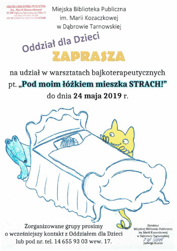 „Pod moim łóżkiem mieszka STRACH!” pod takim tytułem do 24 maja odbywać będą się w Miejskiej Bibliotece Publicznej  w Dąbrowie Tarnowskiej warsztaty bajkoterapeutyczne dla zorganizowanych grup przedszkolnych i szkolnych zapoczątkowane w czasie trwania Tygodnia Bibliotek (8-13 maja).