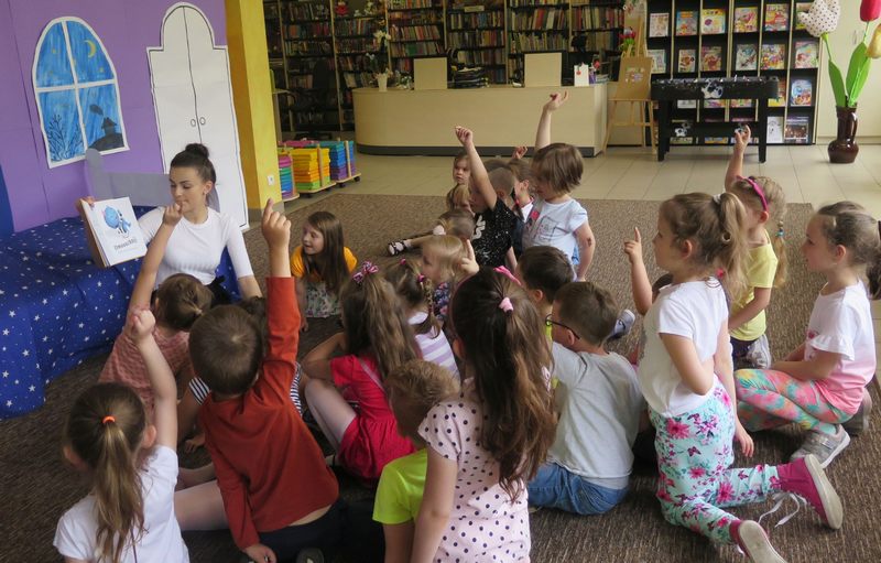 Majowy Poranek z Bajką w Oddziale dla Dzieci Miejskiej Biblioteki Publicznej w Dąbrowie Tarnowskiej był dla smyków z grupy „Biedroneczki” z dąbrowskiej Ochronki doskonałym pretekstem do rozmów o własnych lękach i sposobach radzenia sobie z nimi.