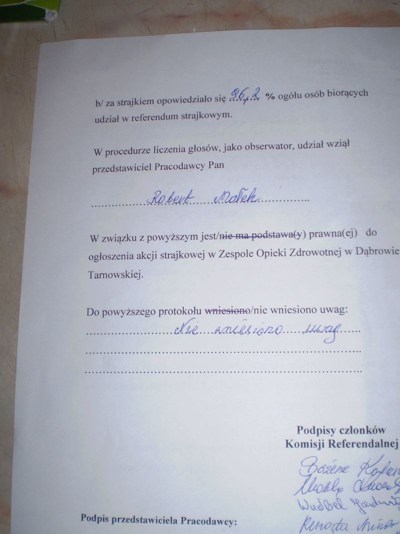Do komisji należeli: przewodnicząca Związku Zawodowego Pielęgniarek i Położnych Bożena Kolarczyk i wiceprzewodnicząca Monika Kwarciak, Renata Minor i Jadwiga Wróbel, a z ramienia dyrektora szpitala głosowanie nadzorował Robert Małek. On również pomagał liczyć głosy, choć w sam proces liczenia włączyli się wszyscy. W ruch weszły długopisy, kartki i kalkulatory w telefonach komórkowych. W protokole po głosowaniu trzeba było podać nie tylko liczbę głosujących, ale także ich procentowy udział.